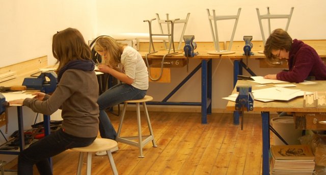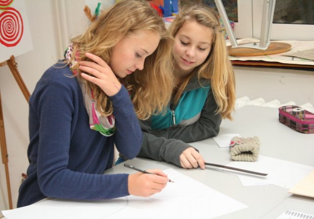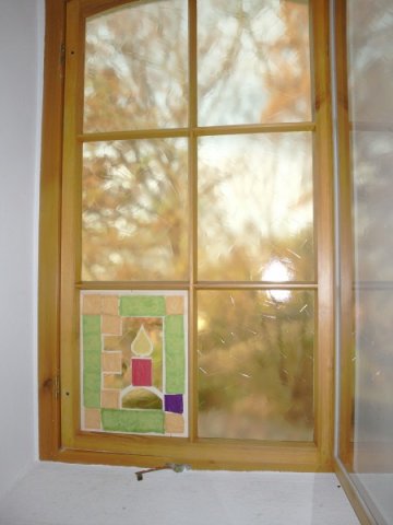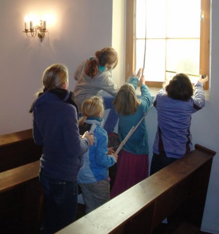 Am Montag in der Kapelle von Kleinnaundorf: Die Schüler des Projekts "Ein ganz besonderer Adventskalender" messen Fenster für den Adventskalender aus. Dieser soll die Kapelle verschönern und Besucher anlocken. Jedes der vier großen Kapellenfenster ist in sechs Teile unterteilt, die zusammen 24 Teilfenster ergeben. Jeden Tag soll in der Adventszeit ein weiteres Bild ins Fenster gehängt werden, bis der Kalender bzw. die vier Fenster gefüllt sind. Immer wenn ein Fenster voll ist, kann man darin eine Geschichte erkennen. So erarbeitet sich eine Projektgruppe ein Hirtenmotiv, eine andere die heiligen drei Könige, wieder eine andere thematisiert die Verkündigung und die letzte Gruppe gestaltet die Krippe mit Jesus. Der komplette Kalender muss allerdings erst im Jahr 2013 zur Adventszeit fertig sein. Deshalb kann die Arbeit in den folgenden Sonderwochen fortgesetzt werden. Den Schülern macht diese Gestaltung sehr viel Spaß und alle freuen sich bereits jetzt auf nächstes Jahr, wenn man den fertigen Kalender in den Kapellefenstern bewundern kann.
