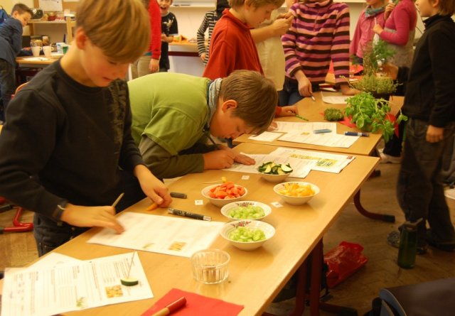 In der Schule ging es anschließend mit einem Flaschenblasexperiment weiter, welches mit mehr oder weniger Begeisterung begrüßt wurde. In mehreren Gruppen sollten die Schüler verschiedenen Flaschen Töne entlocken. Das große Ziel war ein gemeinsames Musikstück. Leider scheinen Orgelexperten wenig belastbar: Einige klagten recht schnell über Übelkeit. Dem Projekt ging die Luft aus und das Konzert wurde leider "abgeblasen".