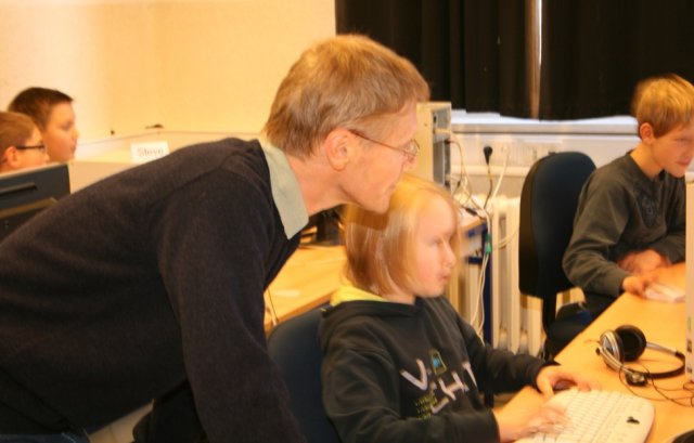Was wir sehr erstaunlich fanden, war, dass an diesem Projekt auch einige Mädchen mitmachten. Man sagst ja sonst immer "Frauen und Technik - zwei Welten". Auf jeden Fall arbeitete die weibliche Fraktion genauso gut wie die männliche. Wenn es mal ein Problem gab, war Herr H. gleich zur Stelle bzw. halfen sich die Schüler gegenseitig. Da auf einmal viele Schüler ein "paar" Problemchen hatten, ermahnte der Leiter die Schüler, gründlicher zuzuhören, denn LOGO funktioniert nur, wenn man alle Befehle exakt ausführt. Die Teilnehmer besannen sich hierauf wieder und zauberten wunderschöne Muster auf ihren Bildschirm. Da mussten wir Reporter natürlich den Hut ziehen. Im Anschluss forderte Herr H. die Schüler auf, gemeinsam etwas zu programmieren, was sie dank Teamwork mit Bravour schafften.