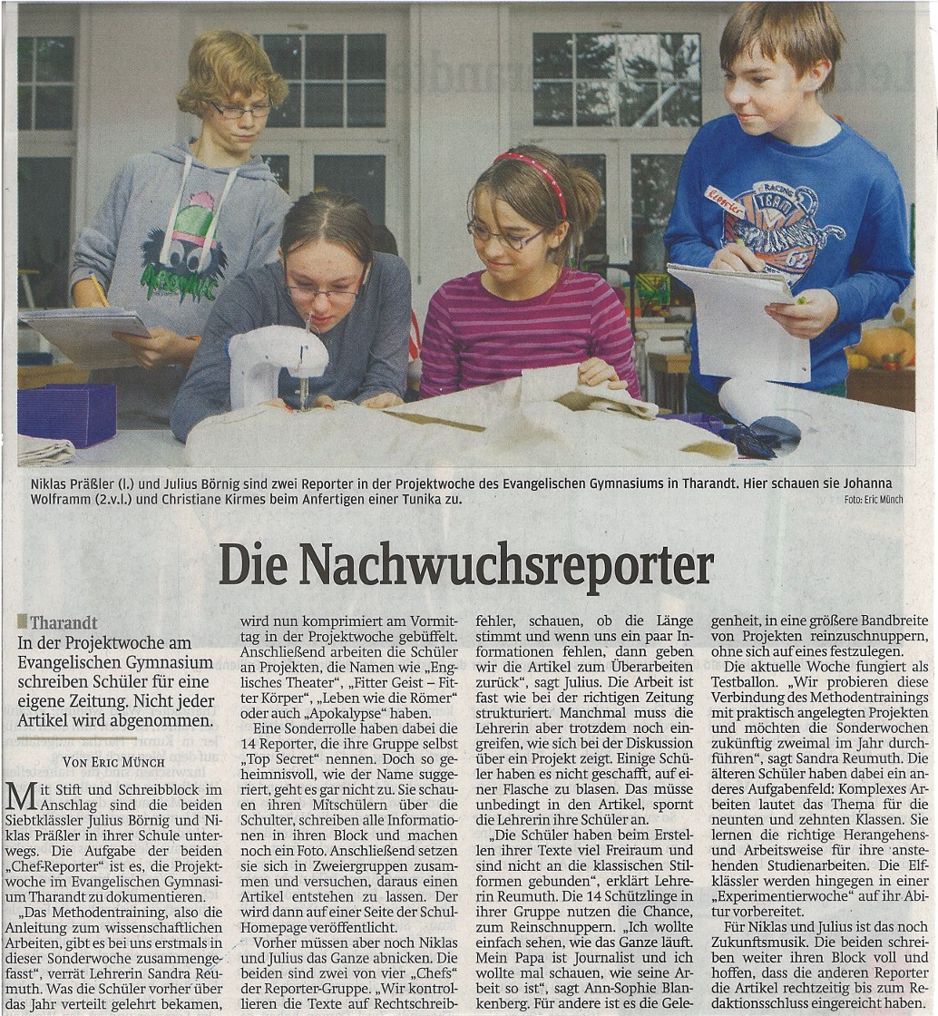 In dem Projekt "top secret" arbeiteten die Schüler als Reporter und verfassten Texte über andere Projekte. "Inkognito" waren sie im Schulhaus unterwegs und haben die verschiedenen Angebote beobachtet bzw. fotografiert. Einige Schüler waren dabei als Chefs tätig. Sie mussten eigene Texte schreiben, nebenher aber zusätzlich die Arbeiten der anderen Mitarbeiter vor der Veröffentlichung kontrollieren. "top secret" hatte den Vorteil, dass den Reportern zu jedem Zimmer jederzeit Zugang gewährt wurde. So konnte man in alles hineinschnuppern, Freunde besuchen und lästige Fragen stellen. Am Donnerstag erhielt die Projektgruppe Besuch von einem Fotografen der Sächsischen Zeitung, der die Reporter interviewte und Bilder in der Schule machte. Wir sind sehr gespannt, ob ein Beitrag über die Sonderwoche am EGT erscheint.