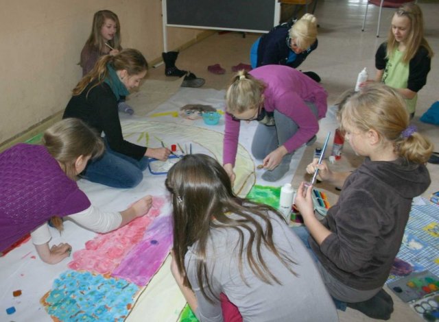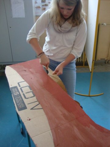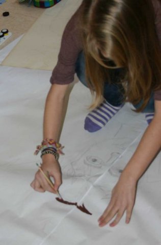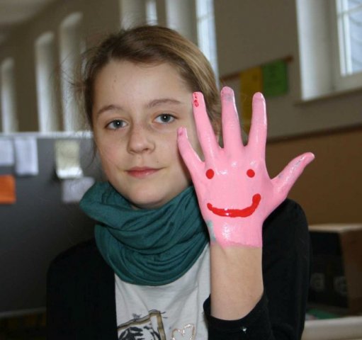 Es wird wieder getüftelt und geprobt und heute dürfen sich alle schminken. Dabei sind sehr lustige und schöne Ergebnisse herausgekommen. Bei den Requisiten läuft alles wieder glatt, doch beim Malen eines Bühnenbildes passiert etwas, was niemand vorausgesehen hat: Ein schwarzer Fleck Farbe klebt an der Wand und der Boden ist übersät mit Farbspritzern, gefolgt von einem Missgeschick: ein Mädchen tritt auf die Bühnenkulisse und diese reißt. Bei der ganzen Aufregung wirft ein anderes Mädchen einen Farbeimer um, blaue Farbe wird auf dem ganzen Boden verteilt. Gleich darauf kommt Frau Lück-Ley und startet die große Putzaktion. Als diese beendet war, führten alle in der Aula zum allerersten Mal vor der gesamten Projektgruppe die Stücke auf. Es war ein voller Erfolg und auch sehr witzig. Außerdem konnten wir endlich einen Einblick in das lustige Stück der anderen Gruppe bekommen: