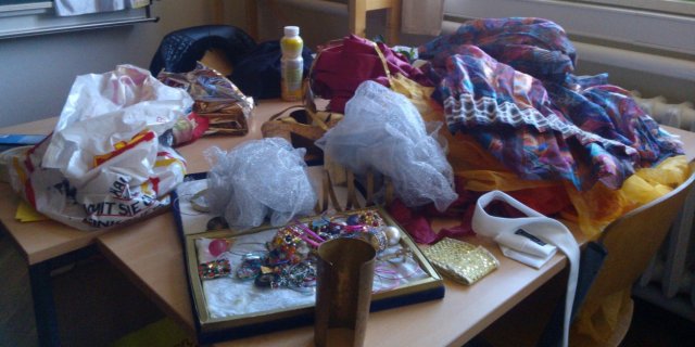 Noch ein letzter Schliff an den Bühnenkulissen, Kostümen und den Texten. Dann wird sich geschminkt und zurechtgemacht. Ein paar Schminkunfälle gibt es auch: eine Puderdose auf dem Kleid, zu viel Make-up im Gesicht und so weiter. Über einige Pannen wurde lauthals gelacht. Jetzt ging es an die letzten Proben. Dann wird endlich das Bühnenbild aufgebaut, an dem zwei Tage gearbeitet wurde. Und dieses Mal konnten wir sogar das Stück der anderen sehen: