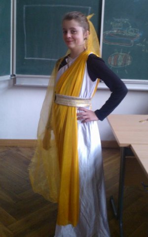Am Montag, den 10. Februar 2014 startete das Projekt „Römisches Theater“. Zuallererst begrüßten Frau Lück-Ley und Herr Kaltofen die Projektteilnehmer und erklärten ihnen, was sie machen wollten. Sie teilten die Schüler in zwei Gruppen und jede Gruppe bekam einen Text, aus dem ein Theaterstück entstehen sollte. Während die Schüler diskutierten, wie, wer oder was alles in dem Stück vorkommen sollte, bereiteten Herr Kaltofen und Frau Lück-Ley die Kostüme und die Requisiten (Pflanzen, Schwerter…), die die Schüler selbst schneidern und gestalten sollten, vor. Als dann die Schüler mit den Texten und den Rollenverteilungen fertig waren, durften sie sich die Kostüme aussuchen, sie gestalten und anziehen. Danach übten sie die selbst geschriebenen Texte mit Kostümen in der Aula auf der Bühne zum ersten Mal, die erste Aufführung war zwar noch ein bisschen wackelig, aber echt genial dargeboten. Eine göttlich-tragische Geschichte, aber auch die andere Gruppe hatte sich sehr viel Mühe gegeben bei ihrem Theaterstück.
