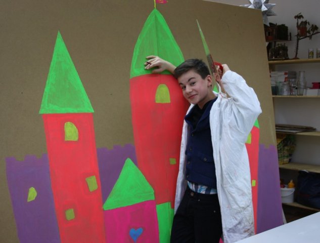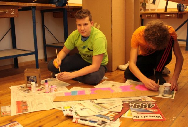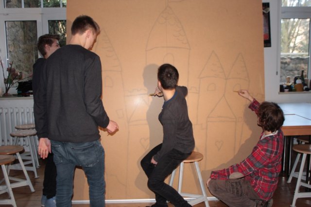Am Anfang der Projektwoche sahen sich die 11 Schüler aus dem Projekt „Schwarzlichttheater“ zur Inspiration einen Film an. Im weiteren Verlauf des Montags gingen sie zum Entwickeln von Entwürfen über. Dabei übertrugen sie Bilder von Torten und Schlössern auf Holzplatten und Pappen. Außerdem wurden heute die Farben der Kulissen festgelegt und die Aufgaben für den morgigen Dienstag verteilt. Die Schüler wirken auf uns motiviert und gut gelaunt - anscheinend gefällt ihnen das Projekt. Zum Ende des Tages besprachen die Schüler noch einmal mit Frau Uibrig, welche das Angebot leitet, die anstehenden Punkte für den nächsten Tag.