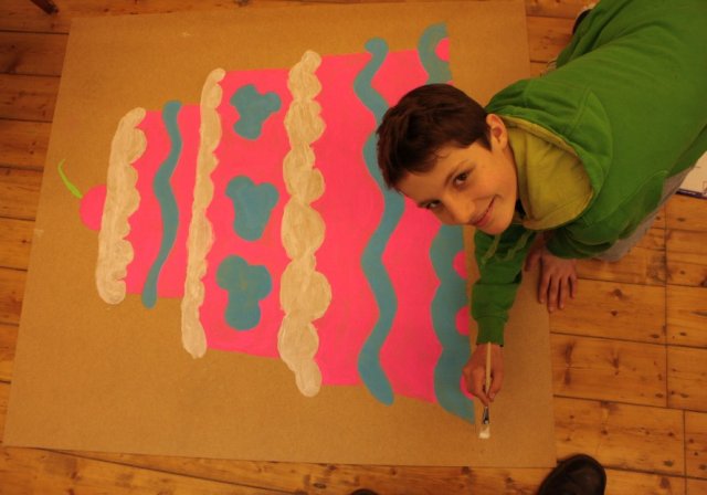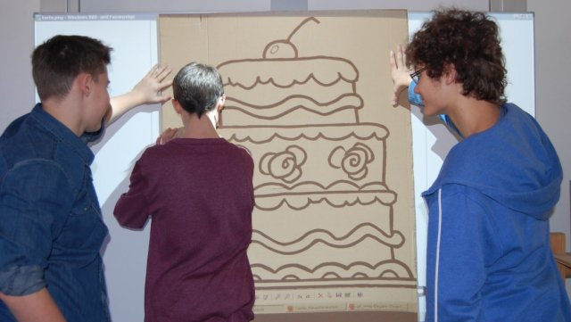 Am Mittwoch wurden von den Schülern des Projektes „Schwarzlichttheater“ ein einzelnes Stück Torte und das Schloss weiter bemalt. Außerdem haben sie an einem Entwurf für einen Baum gearbeitet. Es gab, wie auch die letzten Tage schon, Verpflegung in Form von Süßwaren für die Teilnehmer. Zudem soll die Halterung für das Schloss fertiggestellt werden. Zu Beginn des Tages wurden zwei Stühle, welche für verrückte Tiere verwendet werden sollen, vom Dachboden geholt und im weiteren Tagesverlauf mit Pappen verkleidet und bemalt. Gegen 11 Uhr haben die Schüler die Torte ausgesägt. Um die Arbeit am Schloss in gebückter Haltung angenehmer zu machen, knieten sich die Arbeitenden auf Kissen. Nach dem Mittagessen haben einige Schüler an Lösungen zum Aufstellen des Baumes getüftelt, der Rest arbeitete weiter am Schloss und später auch an den Tieren. Am Ende des Tages war das Schloss fertiggestellt, die Torte und das Tortenstück ausgesägt bzw. ausgeschnitten und einige Formen für Tiere erstellt.
