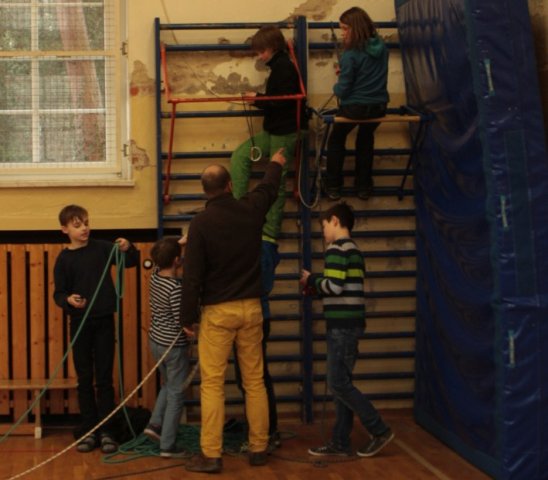 Heute wurden die ersten Vorbereitungen für das Projekt „Seilbahn“ getroffen, den Schülern zeigte man, wie sie sich mit Hilfe von Knoten u.a. sichern können. Es gab verschiedene Gruppen mit speziellen Aufgaben, zum Beispiel musste sich eine Gruppe um das Abbremsen ihrer Mitschüler kümmern. Jede Gruppe war auch zum Teil für die Sicherheit aller zuständig. Heute wurde das Modell der Seilbahn fertiggestellt.