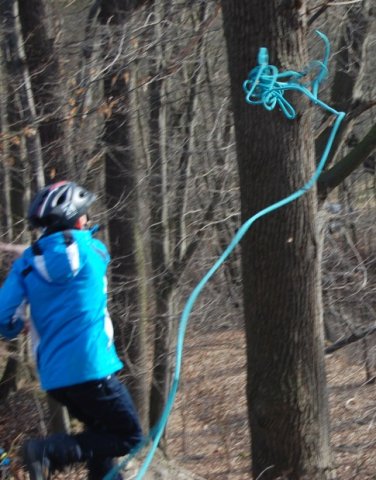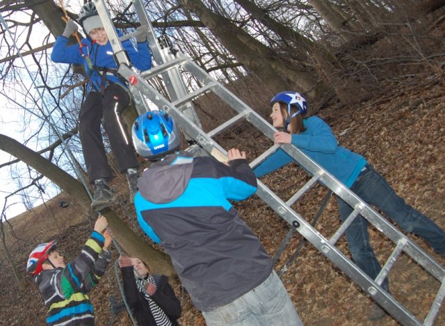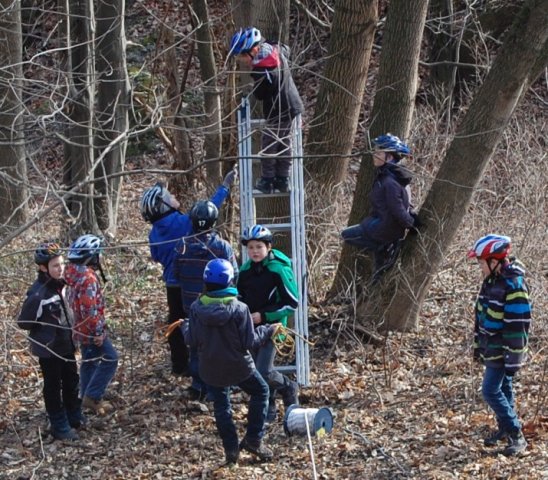 Im Wald wurde heute die Seilbahn aufgebaut, dafür wurden mehrere Seile geworfen und gespannt. Es war sehr lustig alle mit ihren Helmen zu betrachten. Dann war es soweit: der Fünftklässler Christoph konnte als erster Schüler die Seilbahn nutzen. Es sah wirklich sehr spaßig aus, leider durften wir Reporter nur zuschauen.
