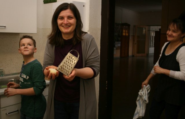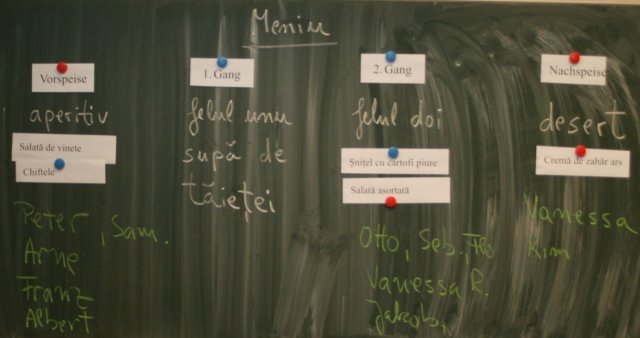 Zuerst stellte Frau Erli die verschiedenen vier Gänge auf Rumänisch mit den dazugehörigen Rezepten vor. Dann ging es auch schon los. 13 Schüler fanden sich in der Küche zusammen und die Aufgaben für die Zubereitung wurden verteilt.