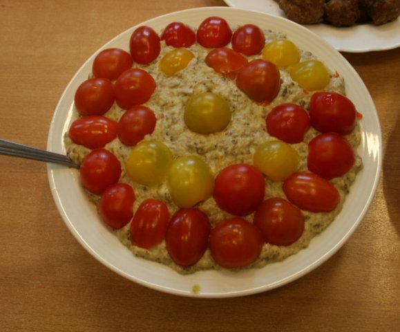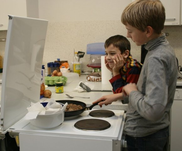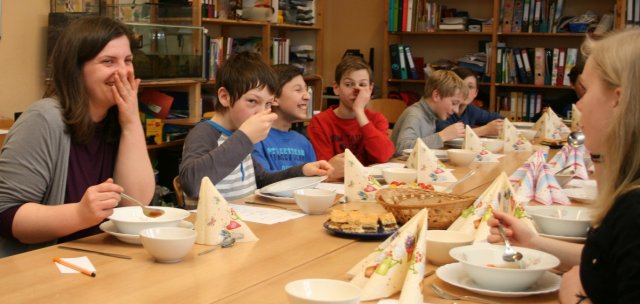 Die Köche kochten mit sehr viel Spaß die Gerichte, während rumänische Musik lief. In der ganzen Schule roch es sofort lecker nach rumänischem Essen: Es gab Auberginenmus mit Tomaten und dazu kleine Fleischbällchen (chiftele) als Vorspeise. Danach wurde den Schülern eine leckere Nudelsuppe als erster Gang serviert, die Frau Erlis Mutter einen Tag zuvor zubereitet hatte. Als zweiten Gang gab es hervorragende Schnitzel mit Kartoffelpüree und Salat. Darauf wurde ein leckeres cremiges Dessert als Nachspeise serviert.