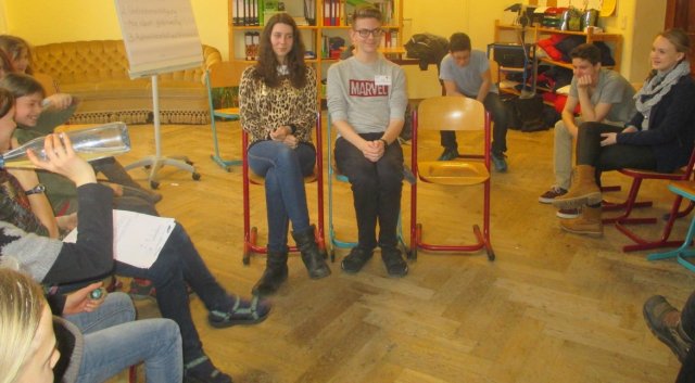 Heute erklärte Herr Ley den Projektteilnehmern, wie man auch ohne Sprache kommunizieren kann. Das veranschaulichte er ihnen mit einem kleinem Sketch. In diesem las eine Frau eine Zeitung und ein Mann versuchte sie anzusprechen. Provokant klappte sie die Zeitung hoch und gab ihm auch ohne Worte zu verstehen, dass sie nicht mit ihm reden möchte.