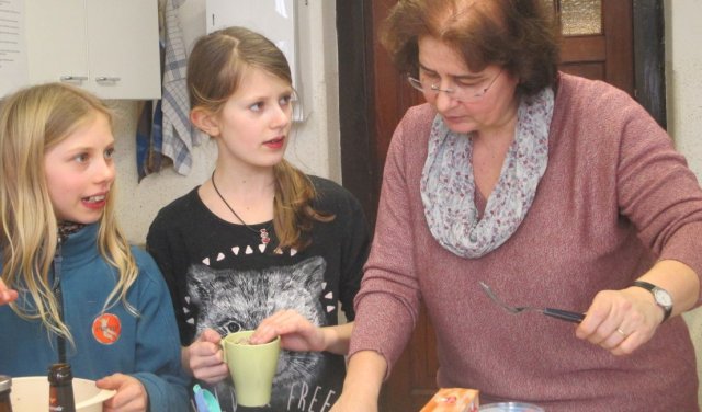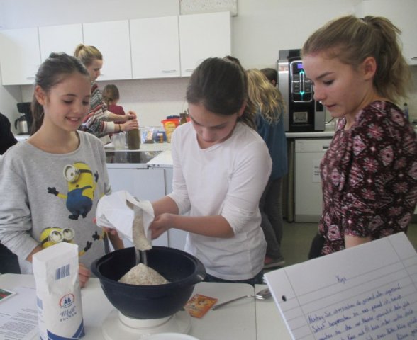 Die Schüler haben einen kurzen Film gesehen und danach eine Ernährungspyramide erstellt. Dadurch stellten sie fest, dass man am Tag sehr viel Wasser trinken sollte. Danach waren die Yoga-Kids unten in der Küche. Dort backten sie verschiedenste Brote und Brötchen. Wir durften viele Fotos schießen. Es sind viele verrückte, aber auch ordentliche Fotos herausgekommen. Wir haben ein Interview mit einem Mädchen aus der 5B gemacht. Sie war in der Gruppe von dem Joghurt-Brot. Wir fragten sie, ob sie dieses außergewöhnliche Brot schon einmal gegessen hätte. Sie antwortete mit: „Nein, nicht dass ich wüsste.“ Ob sie denkt, dass daraus ein leckeres Brot wird? „Ja, natürlich wird es ein leckereres Brot werden.“ Wir flinken Reporter wollten noch eine Stufe höher und fragten sie, ob sie irgendwas mit Ernährung von Beruf her werden möchte. Sie antwortete: „Mir würde es gefallen, aber eigentlich ist es nicht so mein Ding.“ So bedankten wir uns für das kleine Interview und machten uns auf den Weg zu unserer Redaktion. Wir sind nochmal zu unseren Yoga-Kids gegangen und haben miterlebt, wie sie Butter hergestellt haben. Selbstverständlich wollten wir sie nicht enttäuschen, und schnappten uns etwas Kleines von ihren Köstlichkeiten. Es war sehr lecker!