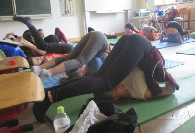 Ihr könnt euch bestimmt schon denken, was sie alles gemacht haben. Als erstes machten sie den “Sonnengruß“. Dann durften sie sich Figuren wünschen. Ein Mädchen hat sich zum Beispiel die “Lotosblüte“ gewünscht. Sie machten die verschiedenen gewünschten Übungen und dann hatte Frau Hausold das Kommando. Danach machten sie noch die Übungen der drei Helden. Zum Schluss machten sie noch eine Reihe von Übungen. So endet unsere schöne Projektwoche vor den Winterferien und wir gehen Morgen bestimmt mit einem guten Zeugnis nach Hause in die Ferien.