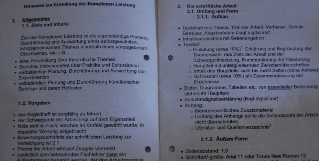 Dabei handelt es sich um eine wissenschaftliche Arbeit zu einem vorgegebenen Rahmenthema (die in einer Art Kolloquium verteidigt werden muss), an welche bereits höhere Ansprüche gestellt werden als an die Projektorientierte Arbeit (POA) in Klasse 9, weshalb dafür auch mehr Arbeitszeit (insgesamt etwa ein halbes Jahr) zur Verfügung steht.