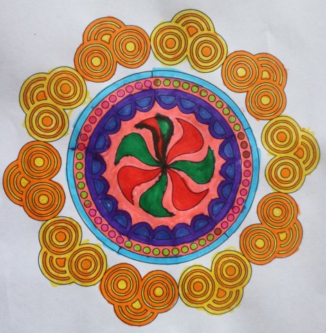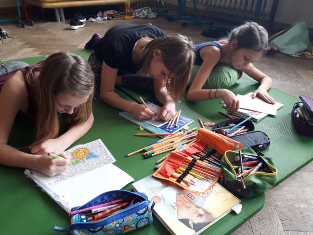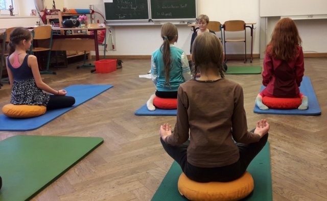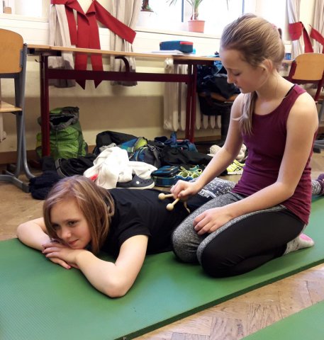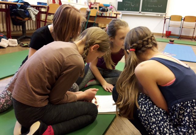 Am Dienstag starteten die Schülerinnen mit einer Meditation und danach hielten sie den Sonnengruß ab. Nach ein paar weiteren Yogaübungen teilte die Projektleiterin Frau Hausold ein paar Mandalas zum Selbstgestalten aus, diese trugen zur Entspannung bei. Die Schülerinnen fingen an diese zu gestalten und nach einer halben Stunde konnte man schon die halb fertigen Ergebnisse betrachten. Danach durften sich die Schülerinnen wieder gegenseitig massieren und entspannen. Als Abschluss las die Projektleiterin noch eine Yoga-Geschichte vor, in der Übungen vorkamen, die die Schülerinnen machen konnten.