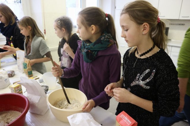 Am Donnerstag trafen sich die Projektteilnehmerinnen wieder in der Küche, da heute Eierkuchen mit Äpfeln, Müsliriegel und Smoothies gemacht wurden. Jeder bekam eine Aufgabe und so machte eine Gruppe die Eierkuchen und die anderen beiden zwei verschiedene Müsliriegel-Sorten. Jeder ging seinen Aufgaben nach und so waren die Schülerinnen pünktlich zum Mittagessen fertig. Alle deckten den Tisch und stellten noch den restlichen Dip und das Brot vom Mittwoch hin. Dazu wurden auch noch Karotten auf den Tisch gestellt und mit dem Dip zusammen gegessen. Nach dem Essen wurde die Küche wieder sauber gemacht und aufgeräumt. Damit endete die Projektwoche.