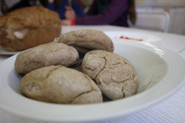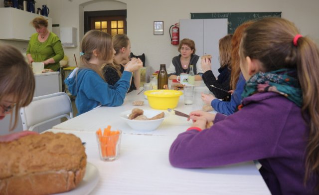 Am Mittwoch ermöglichte Frau Hummel allen Projektbeteiligten kostenlos Brote zu backen; die Küche bietet dafür den besten Platz und deshalb startete das Projekt dort. Zuerst wurden alle Schülerinnen in Gruppen aufgeteilt und jede hat ein Rezept bekommen. Nachdem der Teig zusammengemischt und gut umgerührt war, wurde er auf Blechen und in Formen verteilt und in den Ofen geschoben. Während Brot und Brötchen im Ofen waren, machten die Schülerinnen selber Butter und noch einen Dip, dazu wurden noch Tomate, Paprika und Karotten aufgeschnitten. Als die Brote fertig waren, wurde erst einmal gegessen und es schmeckte allen sehr gut. Nach einer kleinen Pause war es wieder Zeit für Yoga. Am Anfang bekamen die Schülerinnen noch Zeit ihre Mandalas vom Vortag weiter auszumalen und danach entspannten sie sich bei einer Massage. Als Abschluss machten die Schülerinnen noch einige Yogaübungen mit Frau Hausold.