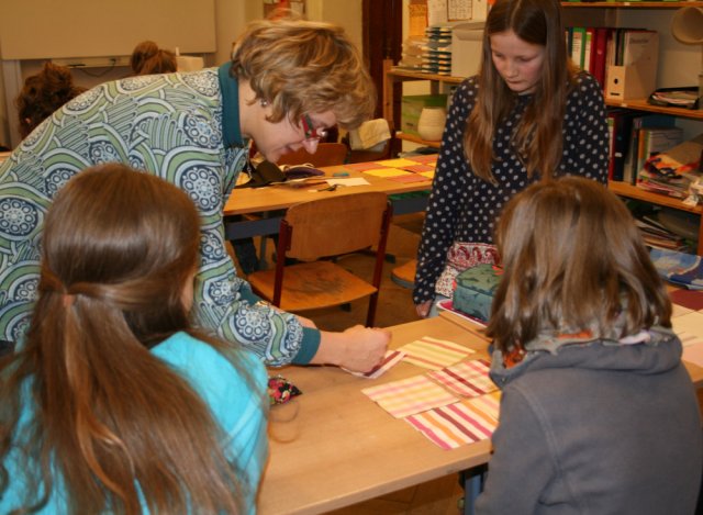 Am Anfang hat Frau Klingauf das weitere Vorgehen erklärt und dann ging es auch schon los. Die Schülerinnen (heute nur noch 11 Mädchen) sind unterschiedlich weit, aber die Nähmaschinen kamen gleich zum Einsatz. Einige Mütter waren auch da, um die beiden Lehrerinnen zu unterstützen, sie haben den jungen Näherinnen bei dem komplizierten Vorgehen geholfen. Danke dafür! Im Klassenzimmer der 5B (103) sollten an diesem Tag die Bezüge fertig genäht werden. Es sind sehr schöne Patchwork-Kissenbezüge entstanden und auch die Mädels sind zufrieden mit ihrer Arbeit.