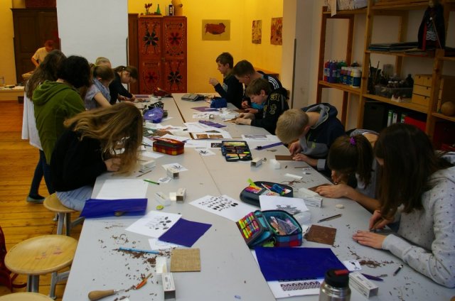 Schüler schneiden in Linoleumplatten ihre Muster, die sie vorher ausgesucht haben. Diese können, wie eben gesagt, vorgegebene Muster sein, die Projektteilnehmer können sich aber auch eigene Muster ausdenken.