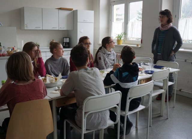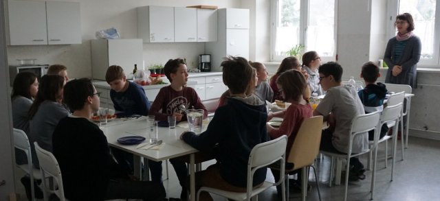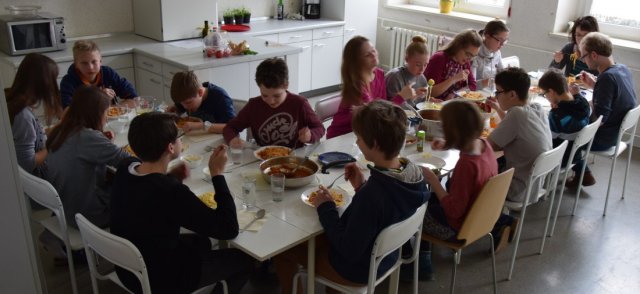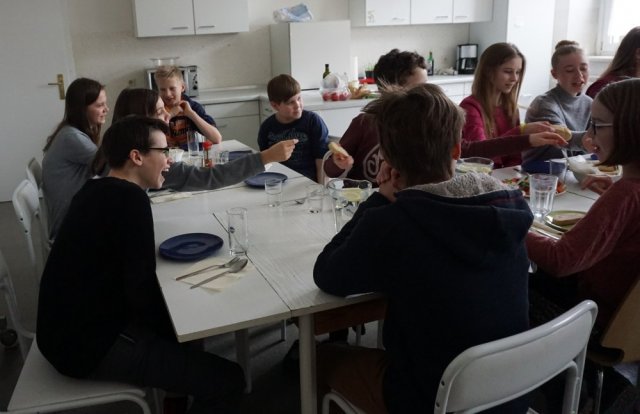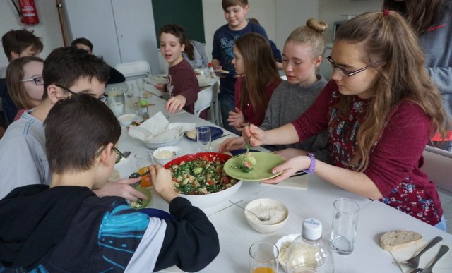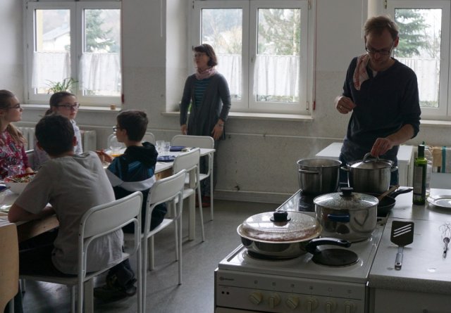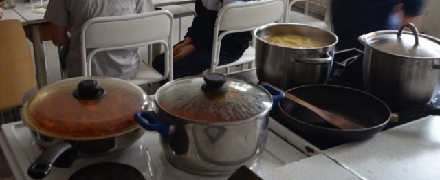 Glücklicherweise stand der zweite Tag des Italienisch-Projektes unter einem besseren Stern als der erste: Wie geplant, konnte heute unter Leitung von Frau Wenzel (und mit Unterstützung von Herrn Krahmer) italienisch gekocht werden. Am Anfang wurden alle Schüler in unterschiedliche Gruppen eingeteilt, die eines der vier Gerichte zubereiten würden. Diese unterscheiden sich in zwei Vorspeisen (Tomate-Mozzarella, Brotsalat), eine Haubtspeise (Spaghetti Bolognese/Pesto) und eine Nachspeise (Tiramisu). Nach langer Zusammenarbeit und Kochen haben wir alles gemeinsam gegessen.