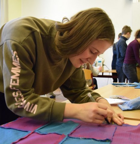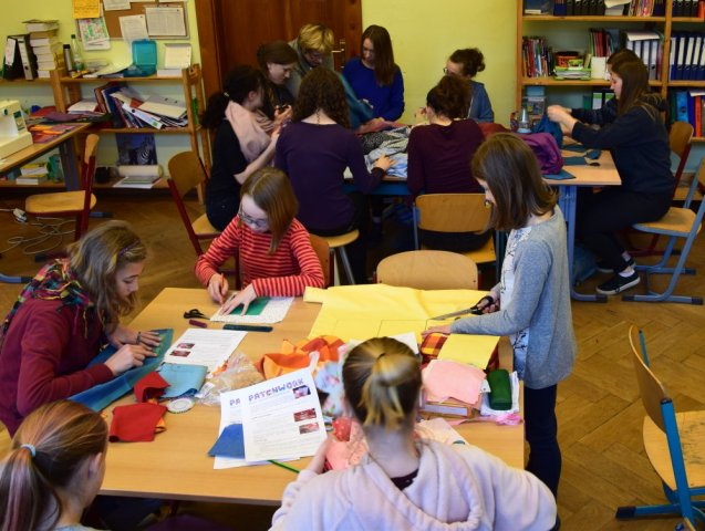 Das Patchwork-Projekt geht heute in die 2. Runde, aber leider nur mit sieben Schülern. Diesmal sind wieder zwei Jungs dabei, die auch eifrig am Nähen sind. Geleitet wird das Projekt dieses Mal von Frau Woldrich.