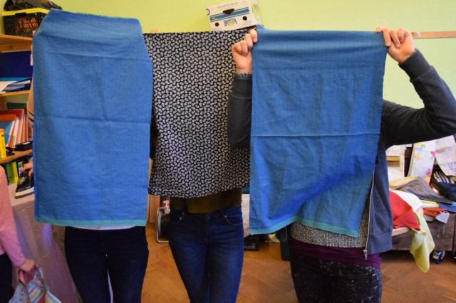 Die Projektteilnehmer sind mit ihren Kissenbezügen unterschiedlich weit gekommen. Die einen sind mit ihrer Vorderseite schon fertig, die anderen arbeiten noch daran. Die Kinder, die mit der Vorderseite schon fertig sind, nähen nun die Rückseite. Dazu nehmen sie ein Stück Stoff (37cm x 42cm) und nähen es an den Rand der Vorderseite an. Danach nehmen sie ein weiteres Stück Stoff (25cm x 42cm) und nähen es so an, das die beiden Stoffteile sich überlappen.
