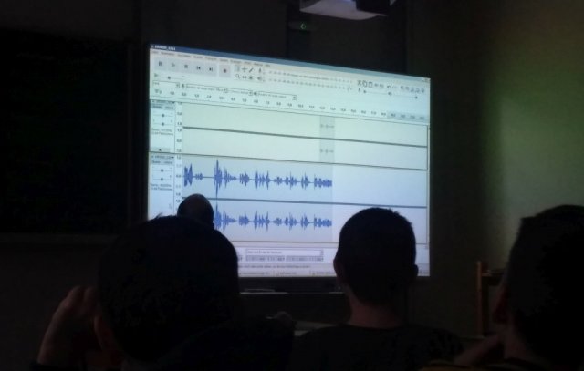 Da nun alle Teile aufgenommen wurden sind, lernen die Schüler, wie man eine Tonreihe bearbeitet, indem sie es auf dem Whiteboard gezeigt bekommen.