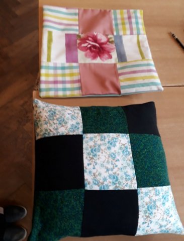 Zum Abschluss des Patchwork-Parts räumten die Teilnehmer auf und machten alle zusammen ein Foto mit ihrem Kissen.