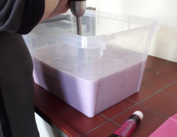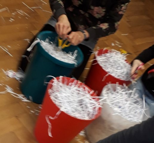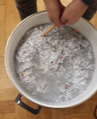 Als sie vom Papierholen zurück waren, schrederten sie es bzw. rissen sie es auseinander. Nun verarbeiten sie es in einem großen Eimer mit Wasser zu neuem sauberem Papier. Doch wie geht das?