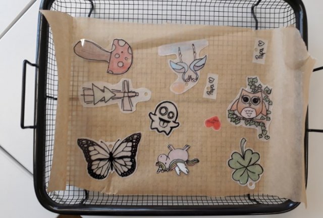 Dies haben wir auf A6-große Plastikstücke gezeichnet und in den Backoffen geschoben. Daraufhin wurden die Anhänger kleiner. Kurz danach schöpften die Schüler Papier und färbten es, dies konnte auch mit Blüten oder anderen Dinge gestaltet werden.