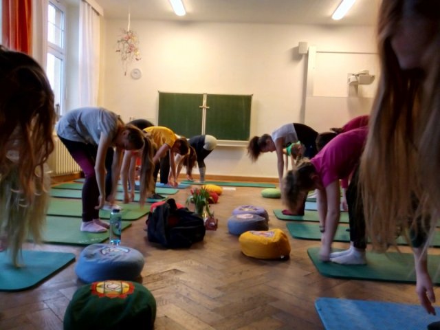 Stille erfüllt den Raum, ab und zu unterbrochen durch das Ticken der Uhr und das Kratzen unserer Stifte. Auf dem Boden liegen Matten und runde Kissen. Wir befinden uns im Zimmer E01, in welchem sich diese Woche rund 20 Schüler mithilfe von Yogaübungen entspannen. Angeleitet wird dieser Schlüssel zur inneren Ruhe und Entspannung von Frau Hausold, die schon 13 Jahre Erfahrung mit Yoga hat.