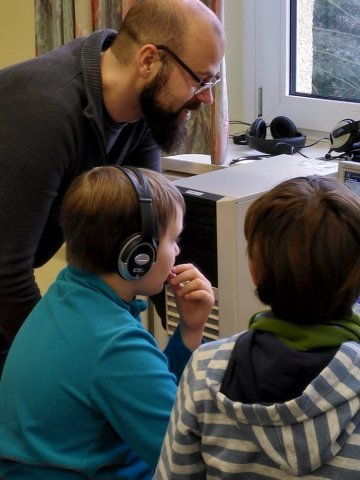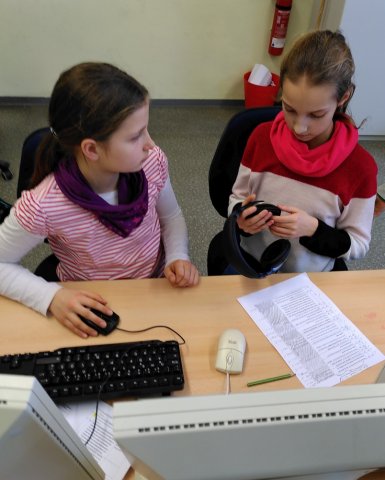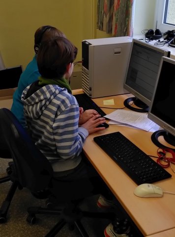 Nach dem Video wurden alle Kinder mit Kopfhörern und Headsets ausgestattet und es ging es in den PC-Raum. Dort haben die Kinder dann gleich damit begonnen, das Programm Audacity zu öffnen und ihre am Vortag aufgenommenen Tonspuren zu bearbeiten. Zwischendurch haben die Fünft- und Sechstklässler natürlich noch etwas herumexperimentiert, bis sie am Ende des Tages ihre Werke gemeinsam anhören konnten.