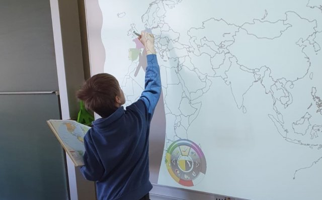 Zu Beginn der 2. Stunde gab es Arbeitsblätter (Thema "Reise einer Jeans" als Beispiel). Zur Bearbeitung benutzten die Schüler und Schülerinnen eine Karte auf dem Arbeitsblatt und eine Karte aus einem Atlas. Beim Vergleich des Arbeitsblattes mit Frau Geißler kam heraus: Eine Jeans muss oft hin und her, da man in Deutschland nicht alle nötigen Mittel besitzt. Außerdem tendiert man zu günstigen Arbeitskräften. Die Umweltstandards sind ebenfalls ein Grund, da sie überall unterschiedlich sind. Das führt natürlich zu einer riesigen Strecke an Kilometern und einem riesigen CO2-Abdruck. Was kann man aber dagegen tun? Es hilft, seine Klamotten länger zu tragen und sie auch als z.B. Arbeits-/Garten-Klamotten zu verwenden. Wenn man seinen Sachen eine zweite Chance gibt, hilft das ebenfalls: Man kann sie in der Familie tauschen, weitergeben, auf Flohmärkten verkaufen oder an Bekannte weitergeben.