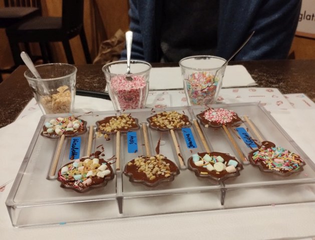 Zuerst wurde die Gruppe – welche heute nur aus 17 Personen bestand – in 2 Hälften geteilt. Eine Hälfte ging zur Herstellung von Schokolollis, der anderen Hälfte wurde eine kleine und sehr informative Führung durch das Museum gegeben. Als beide Gruppen beide Aktionen durchgeführt hatten, gab es noch eine Verkostung mit einem darauffolgenden Quiz, bei dem beide Gruppen gleich gut abschnitten. Zuletzt wurde der Tag noch mit einem Besuch im Laden abgerundet. Wieder in der Schule, gab es noch eine kleine Auswertung und dann gingen die wunderbaren 3 Tage schon viel zu schnell zu Ende.