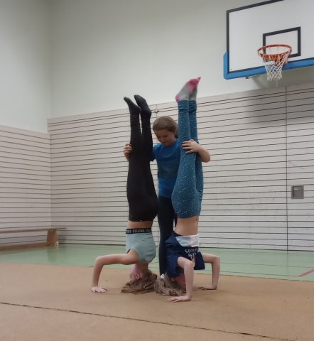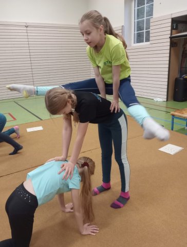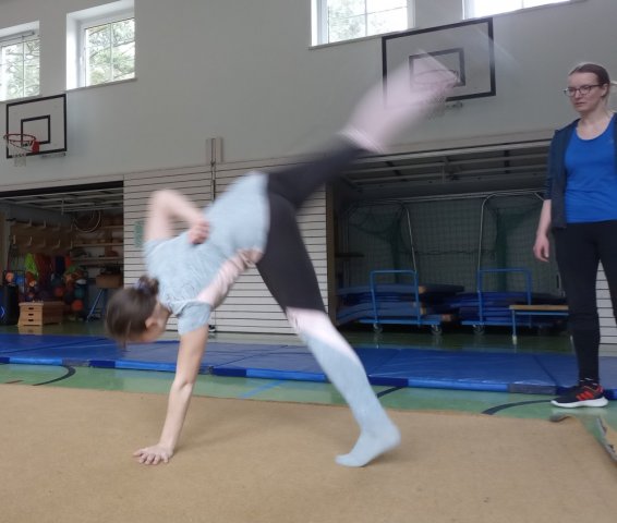 Nachdem wir einen "Schwimmwettbewerb" gemacht hatten, übernahm Frau Magister, die uns für den Rest des Tages betreute. Zuerst spielten wir ein lustiges Spiel, dann machten wir Körperspannungs- und Vertrauensübungen. Gegen 11.00 Uhr spielten wir "Baumstämme" (wir rollten nacheinander über alle drüber). Außerdem machten wir Rollen und Räder.