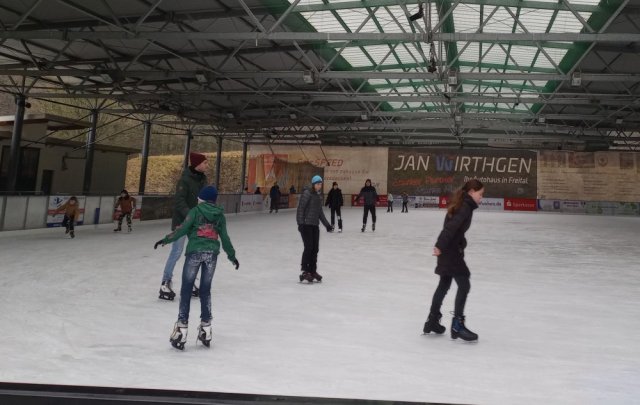 Nach einer kleinen Frühstückspause liefen wir zurück ins Freizeitzentrum „Hains“. Dort durften wir ein paar Runden auf dem Eis drehen. Zusammen mit der Eis & Schnee-Gruppe zeigte uns Frau Stag einige Übungen zum besseren Fahren