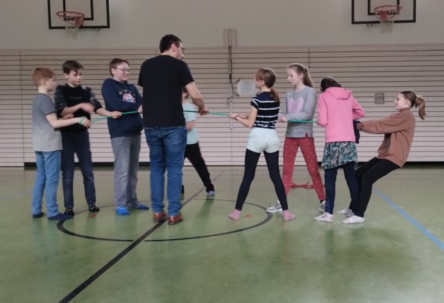 Nach der Frühstückspause ging es mit Herrn Künzl in der Turnhalle weiter, wo wir wie am gestrigen Tag ein paar Konzentrationsübungen und -spiele tätigten.