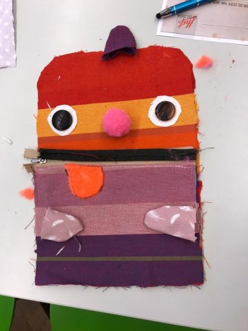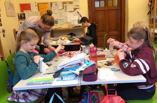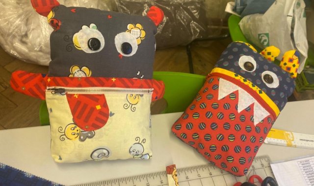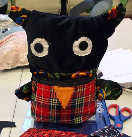 Nach der Vorarbeit haben Schülerinnen angefangen nähen zu üben. Viele konnten schon gut mit Nähmaschine umgehen. Deshalb konnten sie auch bald anfangen, die Stoffteile ihres Sorgenfressers zusammenzunähen. Und das war's jetzt erst mal für heute. Morgen geht es weiter.