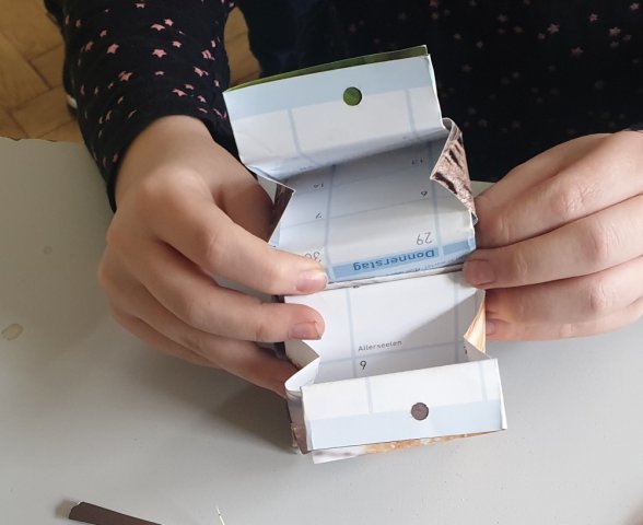 Die Leute, die in der Zeit nichts zu tun hatten, haben aus einem alten Kalender coole und bunte Stifteboxen oder Organizer gebastelt.