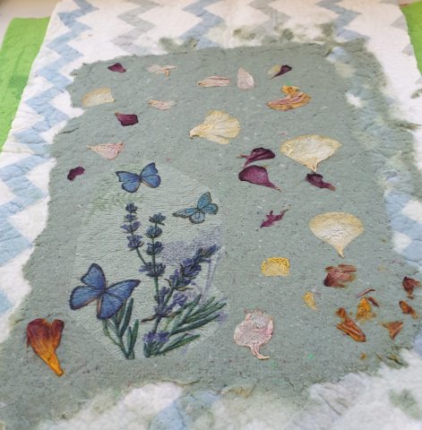 Die Teilnehmer des Projekts Upcycling haben heute das Papier fertig gemacht, indem sie es nun geschöpft und dann mit Farbe eingefärbt haben.