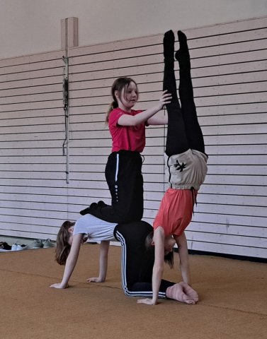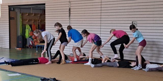 Danach durften wir frei üben, dann wurden wir zusammengerufen für eine Teambesprechung. Wir haben dann als Nächstes ein Figurenbau-Spiel gespielt, um schließlich noch Buchstaben köperlich darzustellen.