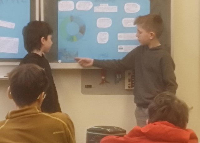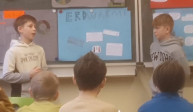 Dann erklärte Thomas der Sonnenenergie-Gruppe, wie eine Solarzelle aufgebaut ist. Danach haben die Gruppen ihre Plakate vorgestellt. Die Erdenergie-Gruppe war nicht so gut vorbereitet, während die Gruppen Wind- und Wasserenergie super vortrugen.