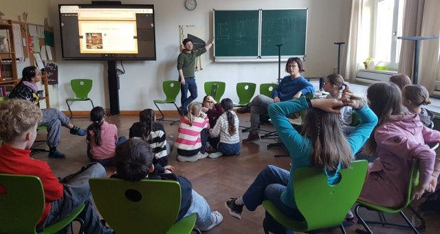 Als wir das volle Klassenzimmer 202 betreten, springt uns die pure Lust und Begeisterung für die englische Sprache förmlich ins Gesicht: Viele begeisterte Kinder machen aktiv bei den Kennenlernspielen und Arbeitsaufträgen mit.