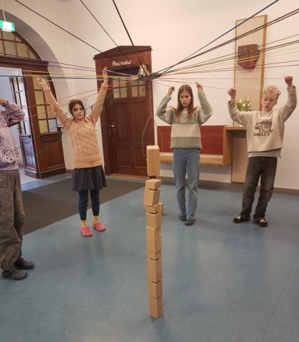 Nach der Frühstückspause spielte die ganze Gruppe ein Übung, bei dem man auf Kärtchen stehende Gefühle nachahmen sollte. Danach gab es für jede Theatergruppe genügend Zeit zum Proben der Stücke, wobei eine Gruppe sich dafür entschied, zur Burgruine zu gehen und dort zu üben.
