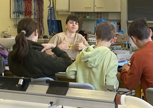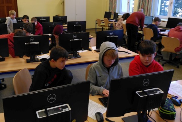 Wir sitzen im PC-Kabinett, die Luft ist warm und stickig. Im PC-Kabinett befinden sich noch weitere zehn Schülerinnen und Schüler sowie Herr Erli und Herr Stankewitz.