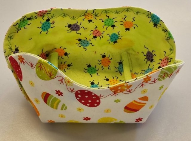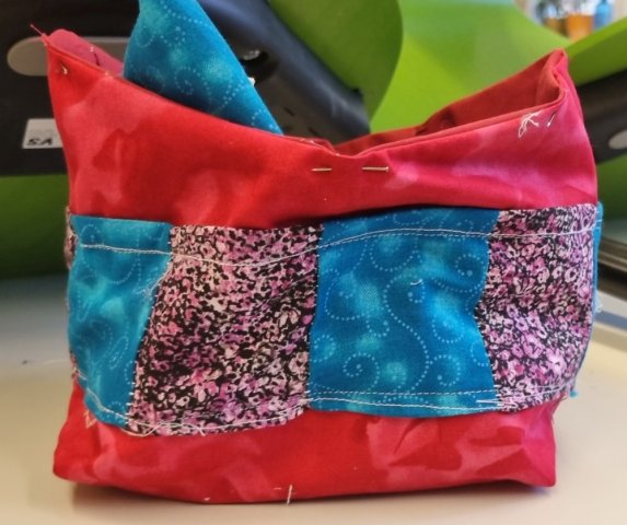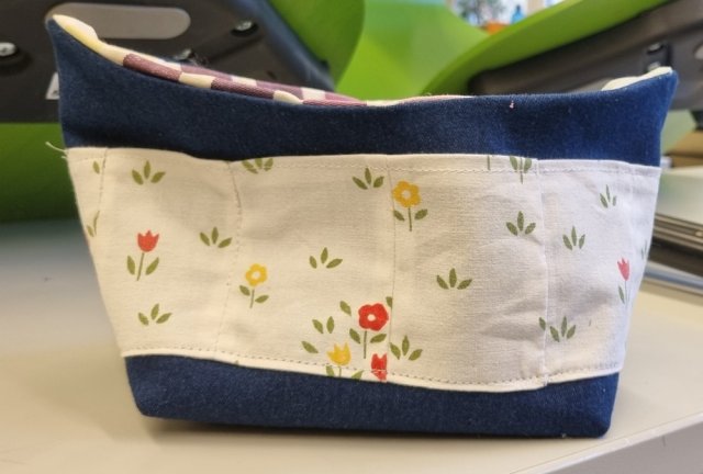 Es besteht aus zwei Außen- und Innenteilen. Die vier ausgeschnittenen Teile wurden gebügelt. Die zwei Außenteile wurden zusammengenäht, umgekrempelt und die zwei Innenteile auch. Die Innenteile wurden dann in die Außenteile genäht. Die Öffnungen zum Umkrempeln wurden dann mit dem Matratzenstich zusammengenäht, der uns gezeigt wurde. Man konnte diesen nämlich nicht sehen. Die Patch-Work-Rechtecke wurden gebügelt, zu 2 mal 6 Streifen zusammengenäht und nochmals gebügelt. Danach wurden sie um das Körbchen herum genäht. Man konnte auch an manchen Stellen die Streifen nicht festnähen, damit kleine Taschen entstehen.