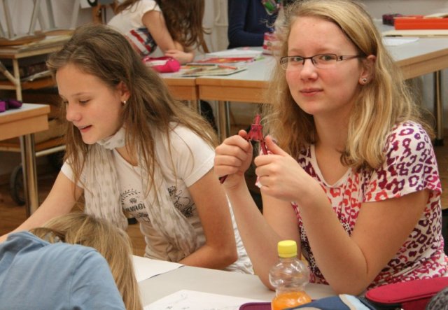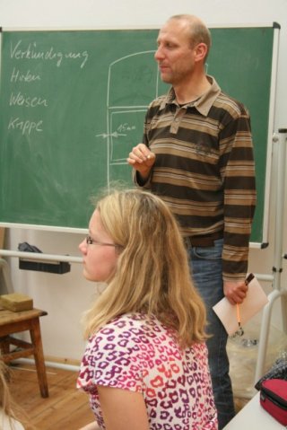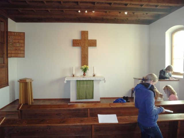 Am Montag in der Kapelle von Kleinnaundorf: Die Schüler des Projekts "Ein ganz besonderer Adventskalender" messen Fenster für den Adventskalender aus. Dieser soll die Kapelle verschönern und Besucher anlocken. Jedes der vier großen Kapellenfenster ist in sechs Teile unterteilt, die zusammen 24 Teilfenster ergeben. Jeden Tag soll in der Adventszeit ein weiteres Bild ins Fenster gehängt werden, bis der Kalender bzw. die vier Fenster gefüllt sind. Immer wenn ein Fenster voll ist, kann man darin eine Geschichte erkennen. So erarbeitet sich eine Projektgruppe ein Hirtenmotiv, eine andere die heiligen drei Könige, wieder eine andere thematisiert die Verkündigung und die letzte Gruppe gestaltet die Krippe mit Jesus. Der komplette Kalender muss allerdings erst im Jahr 2013 zur Adventszeit fertig sein. Deshalb kann die Arbeit in den folgenden Sonderwochen fortgesetzt werden. Den Schülern macht diese Gestaltung sehr viel Spaß und alle freuen sich bereits jetzt auf nächstes Jahr, wenn man den fertigen Kalender in den Kapellefenstern bewundern kann.