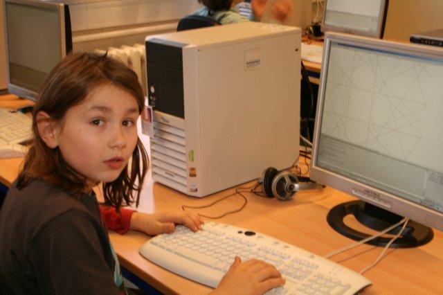 Was wir sehr erstaunlich fanden, war, dass an diesem Projekt auch einige Mädchen mitmachten. Man sagst ja sonst immer "Frauen und Technik - zwei Welten". Auf jeden Fall arbeitete die weibliche Fraktion genauso gut wie die männliche. Wenn es mal ein Problem gab, war Herr H. gleich zur Stelle bzw. halfen sich die Schüler gegenseitig. Da auf einmal viele Schüler ein "paar" Problemchen hatten, ermahnte der Leiter die Schüler, gründlicher zuzuhören, denn LOGO funktioniert nur, wenn man alle Befehle exakt ausführt. Die Teilnehmer besannen sich hierauf wieder und zauberten wunderschöne Muster auf ihren Bildschirm. Da mussten wir Reporter natürlich den Hut ziehen. Im Anschluss forderte Herr H. die Schüler auf, gemeinsam etwas zu programmieren, was sie dank Teamwork mit Bravour schafften.
