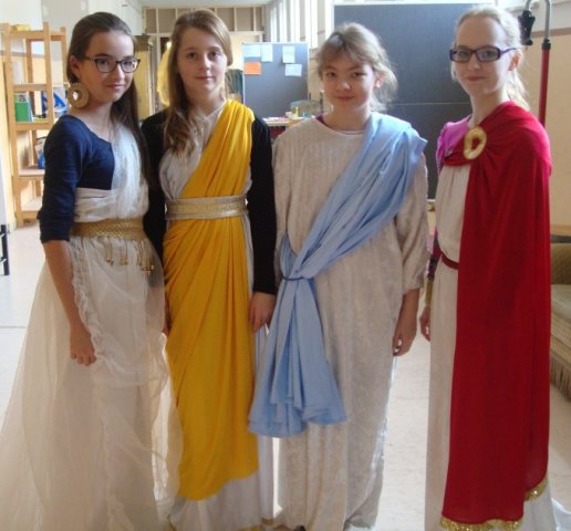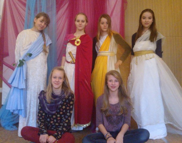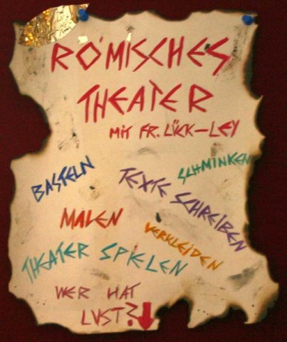 Am Montag, den 10. Februar 2014 startete das Projekt „Römisches Theater“. Zuallererst begrüßten Frau Lück-Ley und Herr Kaltofen die Projektteilnehmer und erklärten ihnen, was sie machen wollten. Sie teilten die Schüler in zwei Gruppen und jede Gruppe bekam einen Text, aus dem ein Theaterstück entstehen sollte. Während die Schüler diskutierten, wie, wer oder was alles in dem Stück vorkommen sollte, bereiteten Herr Kaltofen und Frau Lück-Ley die Kostüme und die Requisiten (Pflanzen, Schwerter…), die die Schüler selbst schneidern und gestalten sollten, vor. Als dann die Schüler mit den Texten und den Rollenverteilungen fertig waren, durften sie sich die Kostüme aussuchen, sie gestalten und anziehen. Danach übten sie die selbst geschriebenen Texte mit Kostümen in der Aula auf der Bühne zum ersten Mal, die erste Aufführung war zwar noch ein bisschen wackelig, aber echt genial dargeboten. Eine göttlich-tragische Geschichte, aber auch die andere Gruppe hatte sich sehr viel Mühe gegeben bei ihrem Theaterstück.