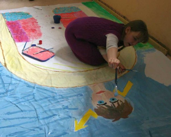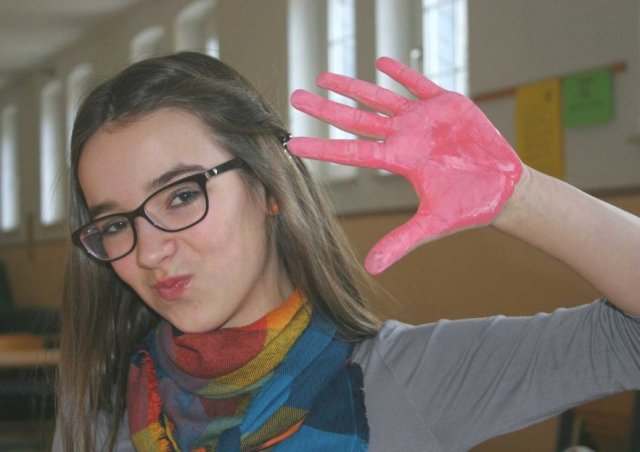 Es wird wieder getüftelt und geprobt und heute dürfen sich alle schminken. Dabei sind sehr lustige und schöne Ergebnisse herausgekommen. Bei den Requisiten läuft alles wieder glatt, doch beim Malen eines Bühnenbildes passiert etwas, was niemand vorausgesehen hat: Ein schwarzer Fleck Farbe klebt an der Wand und der Boden ist übersät mit Farbspritzern, gefolgt von einem Missgeschick: ein Mädchen tritt auf die Bühnenkulisse und diese reißt. Bei der ganzen Aufregung wirft ein anderes Mädchen einen Farbeimer um, blaue Farbe wird auf dem ganzen Boden verteilt. Gleich darauf kommt Frau Lück-Ley und startet die große Putzaktion. Als diese beendet war, führten alle in der Aula zum allerersten Mal vor der gesamten Projektgruppe die Stücke auf. Es war ein voller Erfolg und auch sehr witzig. Außerdem konnten wir endlich einen Einblick in das lustige Stück der anderen Gruppe bekommen: