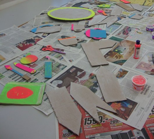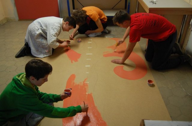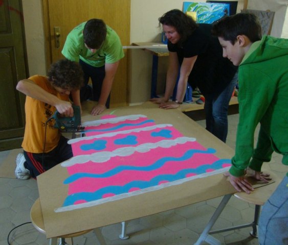 Am Mittwoch wurden von den Schülern des Projektes „Schwarzlichttheater“ ein einzelnes Stück Torte und das Schloss weiter bemalt. Außerdem haben sie an einem Entwurf für einen Baum gearbeitet. Es gab, wie auch die letzten Tage schon, Verpflegung in Form von Süßwaren für die Teilnehmer. Zudem soll die Halterung für das Schloss fertiggestellt werden. Zu Beginn des Tages wurden zwei Stühle, welche für verrückte Tiere verwendet werden sollen, vom Dachboden geholt und im weiteren Tagesverlauf mit Pappen verkleidet und bemalt. Gegen 11 Uhr haben die Schüler die Torte ausgesägt. Um die Arbeit am Schloss in gebückter Haltung angenehmer zu machen, knieten sich die Arbeitenden auf Kissen. Nach dem Mittagessen haben einige Schüler an Lösungen zum Aufstellen des Baumes getüftelt, der Rest arbeitete weiter am Schloss und später auch an den Tieren. Am Ende des Tages war das Schloss fertiggestellt, die Torte und das Tortenstück ausgesägt bzw. ausgeschnitten und einige Formen für Tiere erstellt.